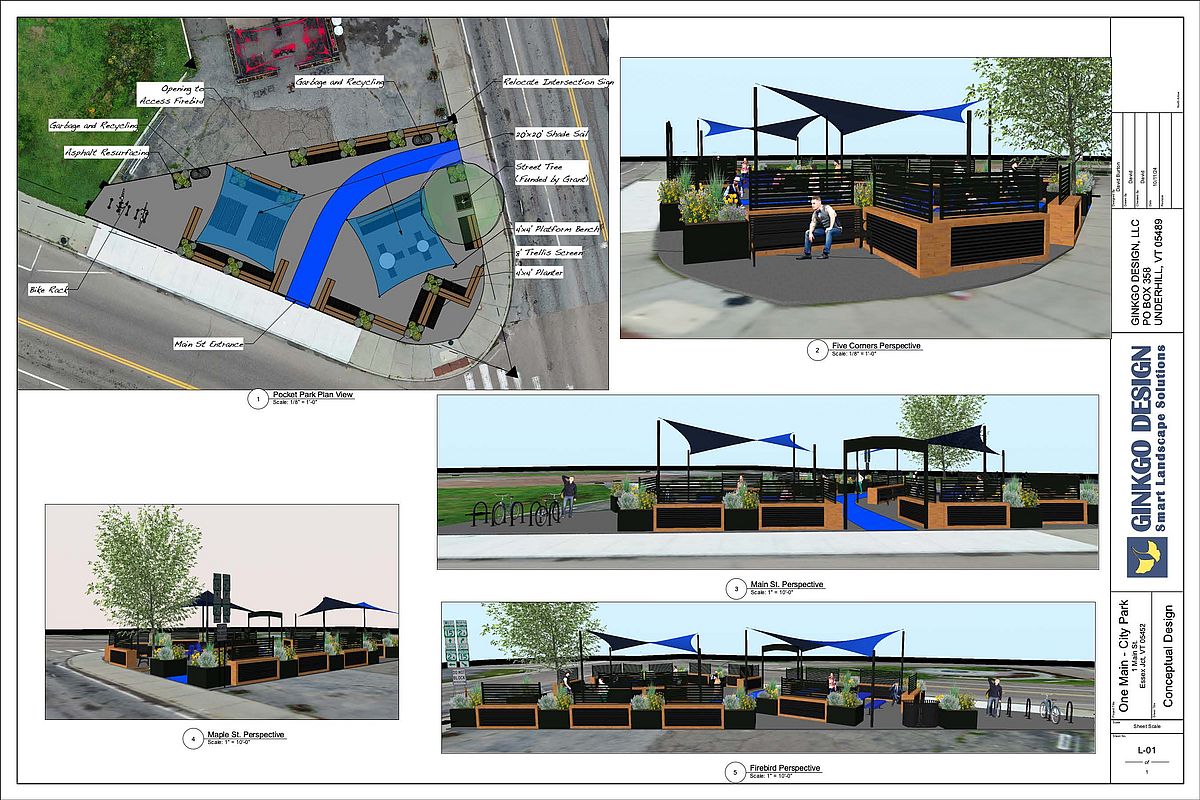 The City of Essex Junction is creating a small public pocket park at 1 Main Street, located at the Five Corners area in front of Firebird Café. The project is approved and currently in the design phase, and is funded in partnership with the State of Vermont through a Downtown Transportation Fund grant with a local match.