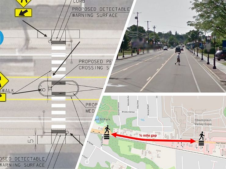The City of Essex Junction is working with CCRPC and consultant Hoyle Tanner to evaluate the potential adding a designated pedestrian crossing across Pearl Street (VT15) between Warner Avenue and Weston Way. This section of Pearl Street does not currently have a crosswalk and is designated as a Class 1 Town Highway with bus stops on both sides of the street.
